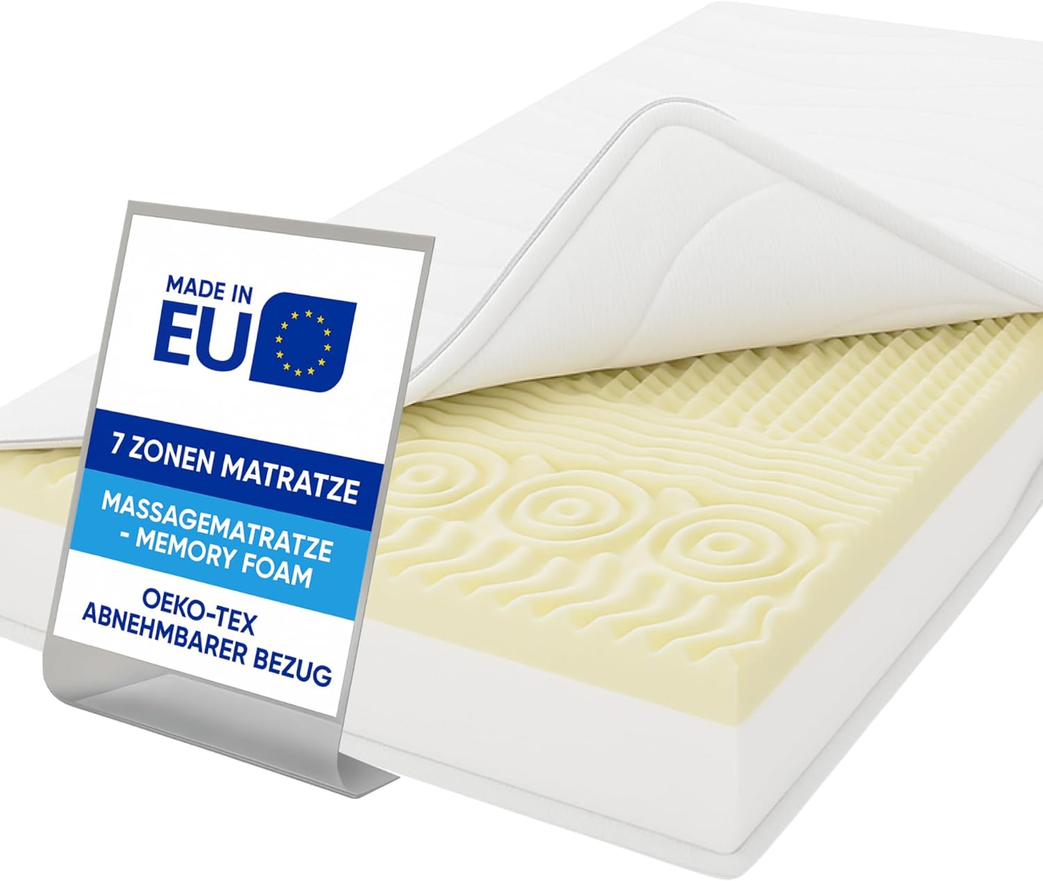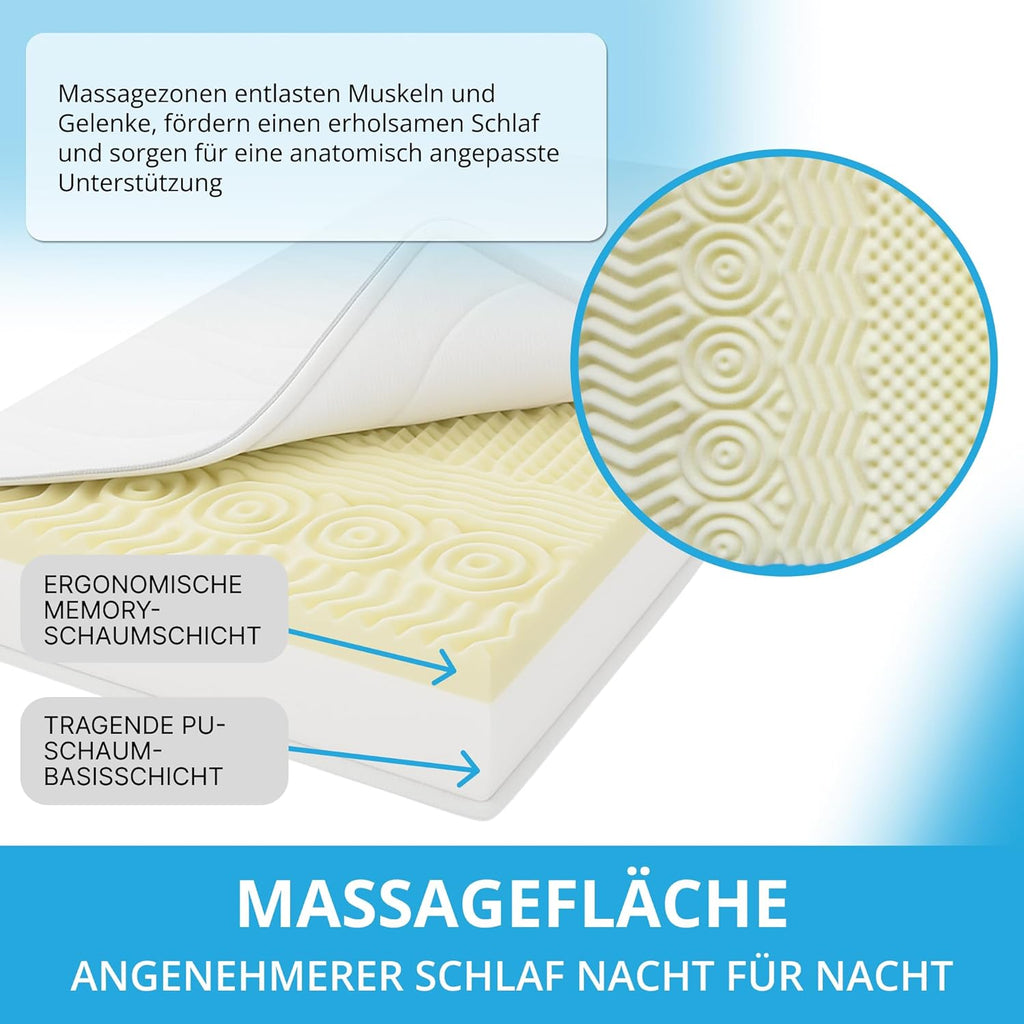 - 🛌 𝟳-𝗭𝗼𝗻𝗲𝗻-𝗠𝗲𝗺𝗼𝗿𝘆-𝗙𝗼𝗮𝗺 𝗳ü𝗿 𝗽𝘂𝗻𝗸𝘁𝗴𝗲𝗻𝗮𝘂𝗲 𝗘𝗻𝘁𝗹𝗮𝘀𝘁𝘂𝗻𝗴: Die 3 cm starke Memory-Foam-Schicht passt sich individuell an die Körperform an. Sie ist in 7 Zonen unterteilt, die gezielt Schultern, Rücken und Hüfte unterstützen – für gesunden und rückenschonenden Schlaf.
